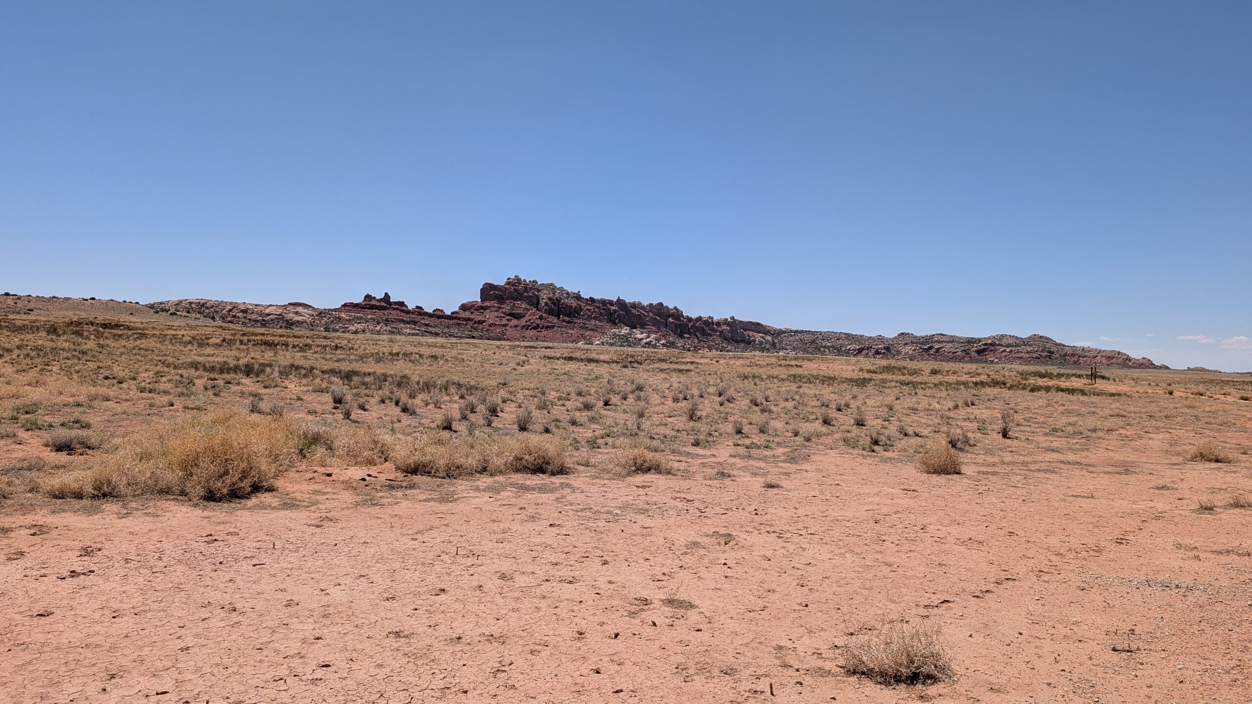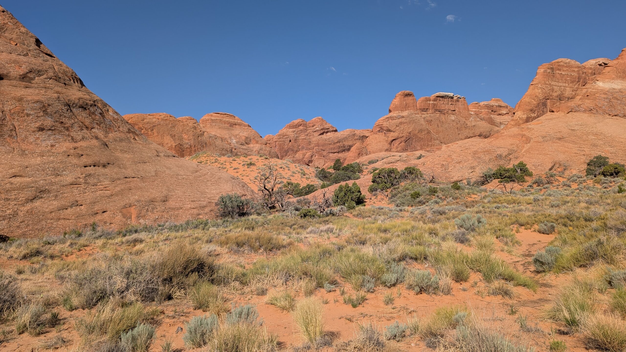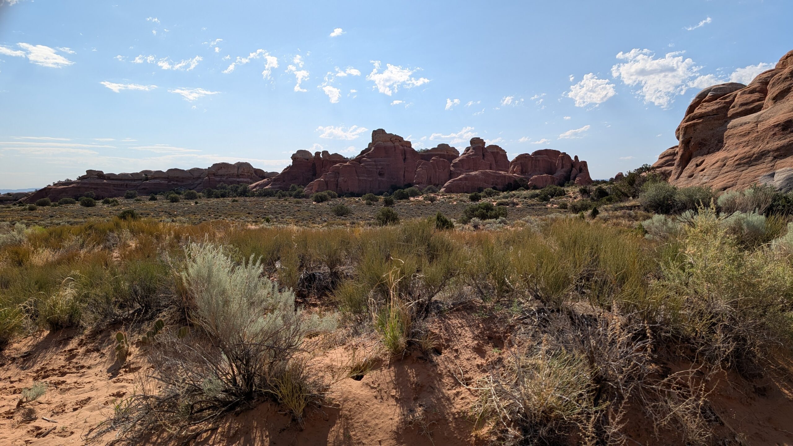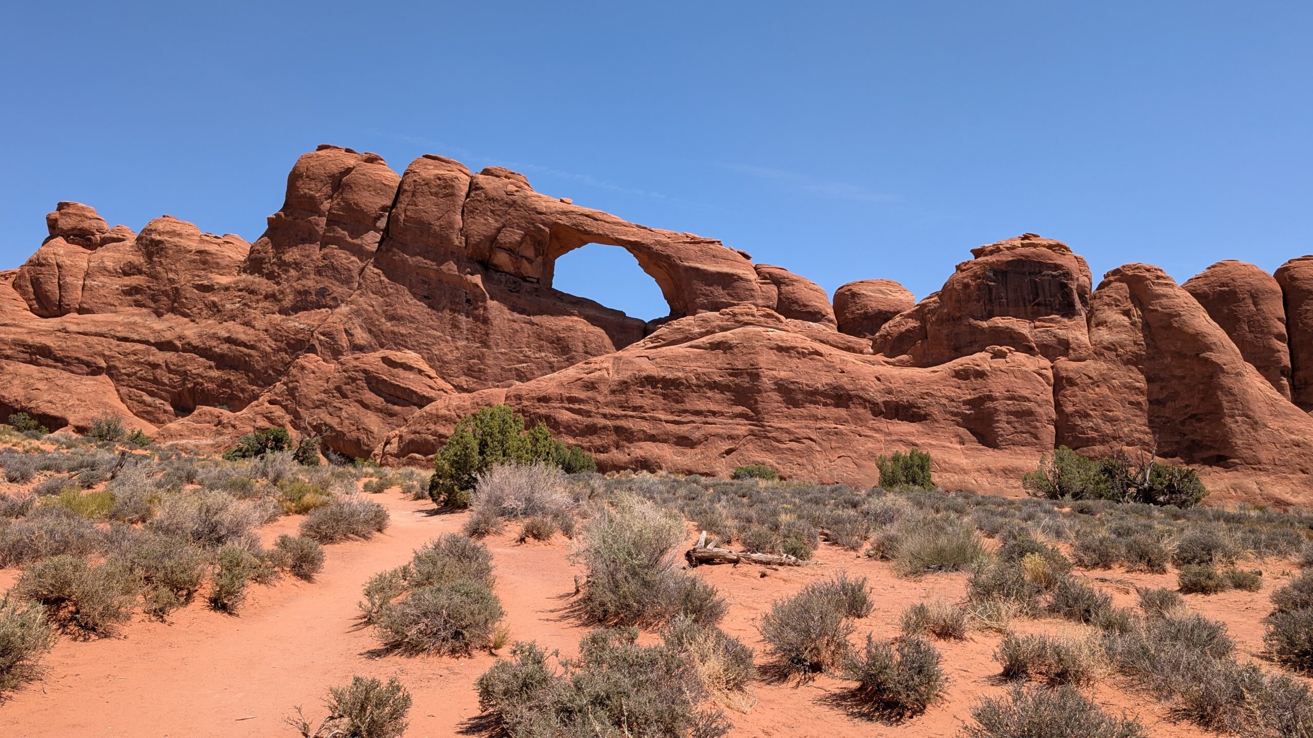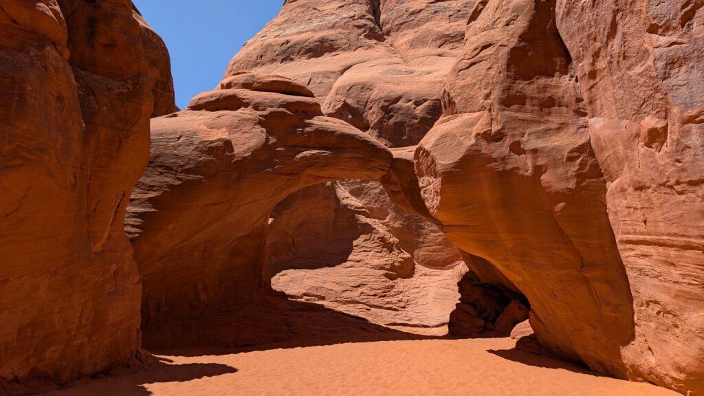 Next we visited Sand Dune Arch, where the kids had a blast playing in the caves and sand. The picture is above in Megan’s part of the post. They stayed there and enjoyed themselves while I hiked the 1.3 miles out to Broken Arch, which I suppose gets its name either from the debris below it or because of the crack in the middle. I assume it’s the latter.