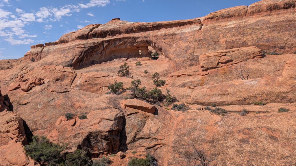 The first arch we saw on today’s hikes was Tunnel Arch, so named because the wall it goes through is quite thick, which might be apparent from this picture, taking close look at the shadows.
