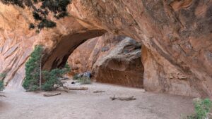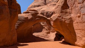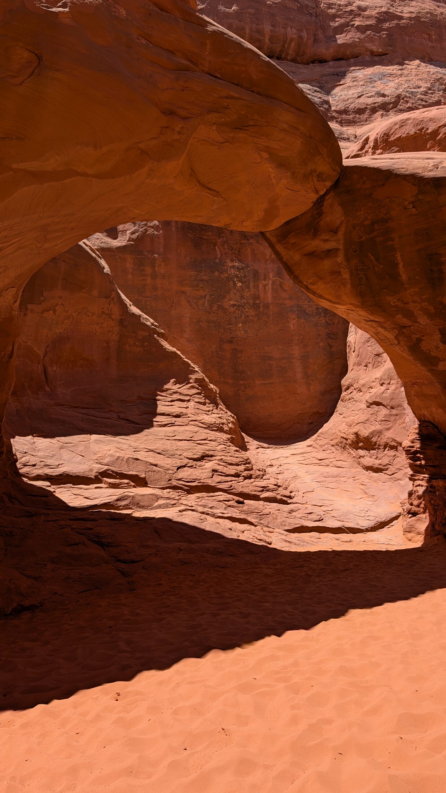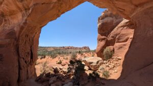The Navajo Arch isn’t as much of a window as most of the arches we saw, because there’s a wall right behind it, but it does create an atmosphere very different from the others because of how close the tall cliffs are.