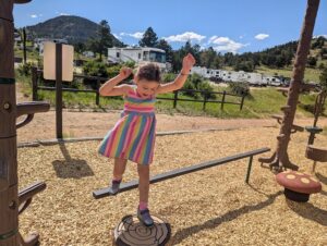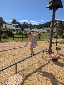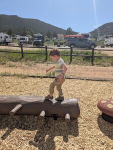 We checked into our campground at Estes Park at Mary’s Lake – such a relief to be out of Colorado Springs. We’re right next to the bathroom and a cool playground.