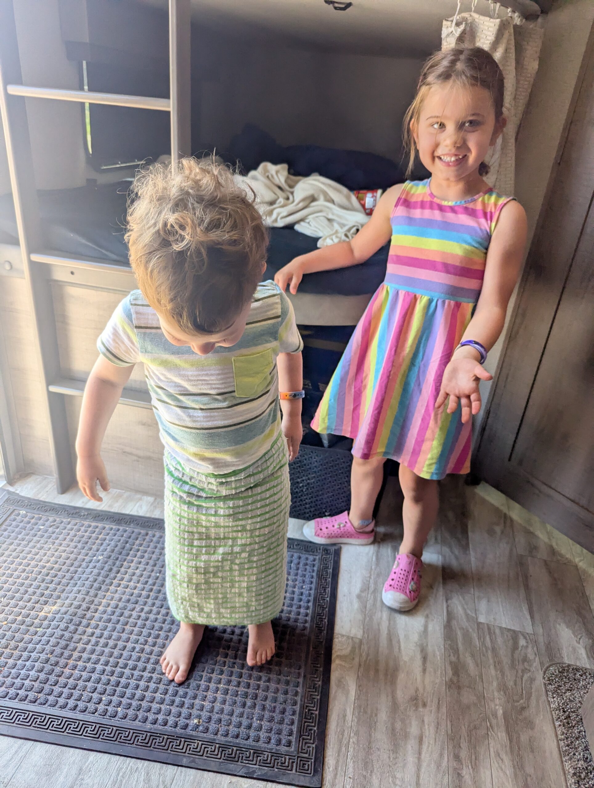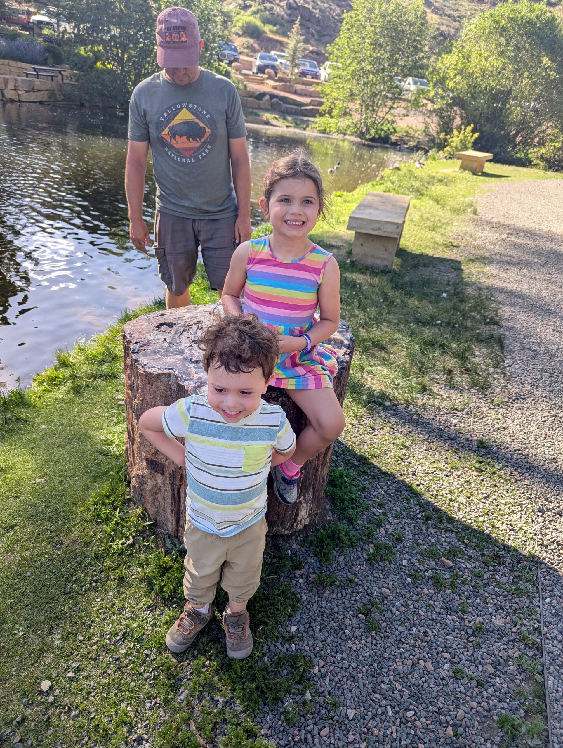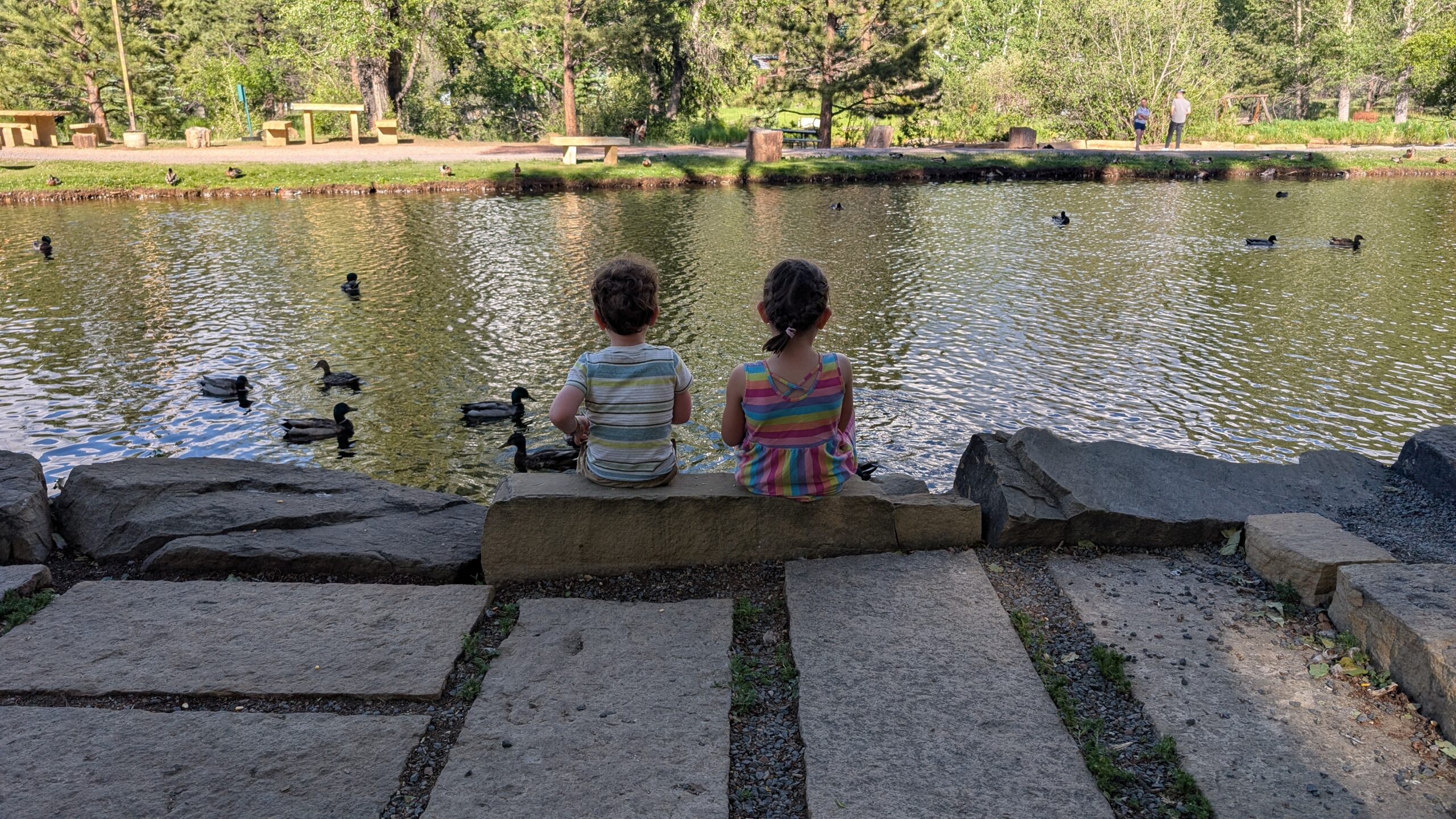 Tonight we got dinner and ice cream downtown and stopped at a couple rock shops. One of them had a little duck pond behind it, and a woman feeding the ducks shared her feed with Emilia and Emmett. They were very excited about feeding the ducks piece by piece, and Emmett called out, “come here ducks! I have something tasty for you!” They made sure all the corn feed got distributed to the surrounding ducks.