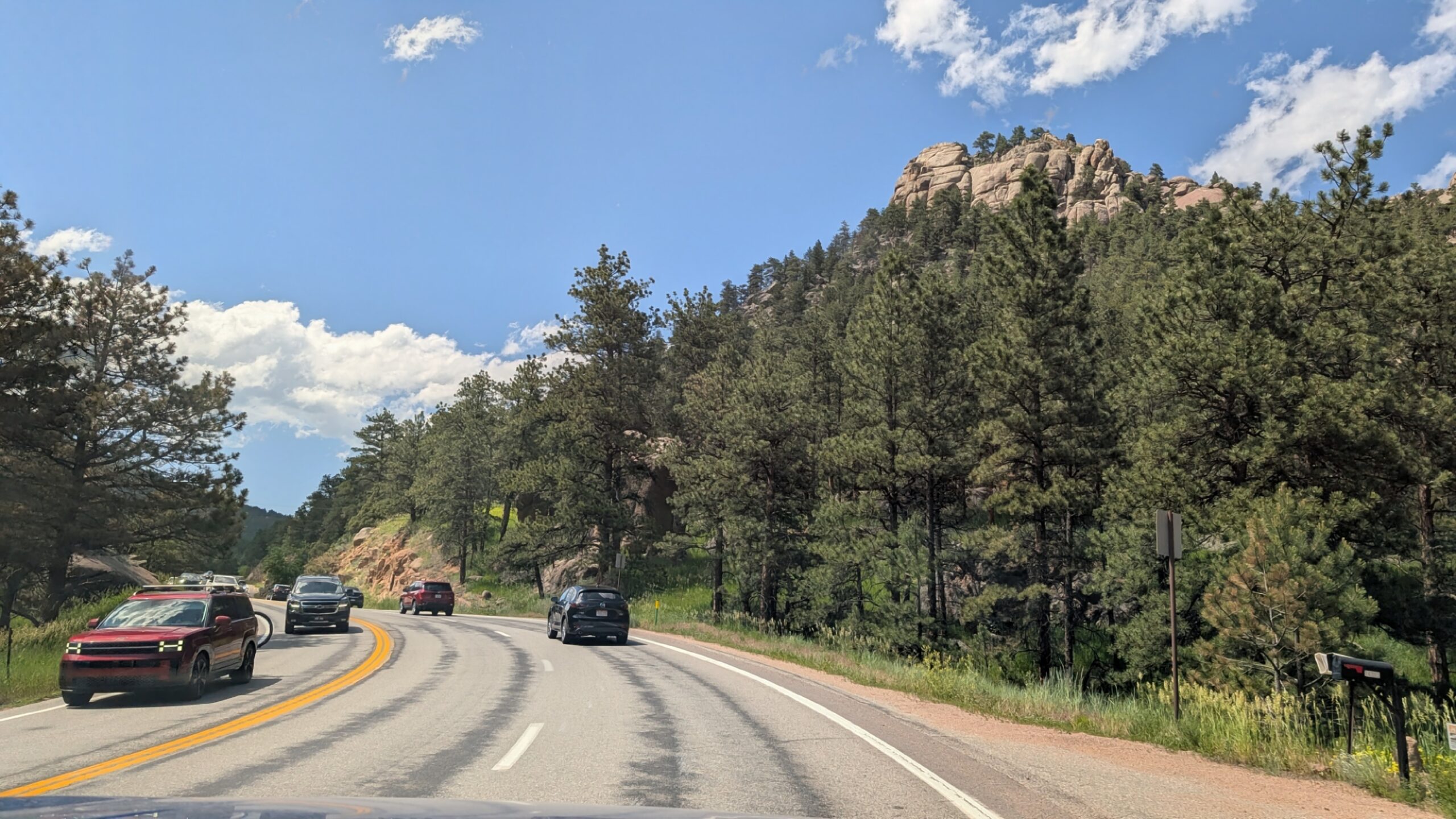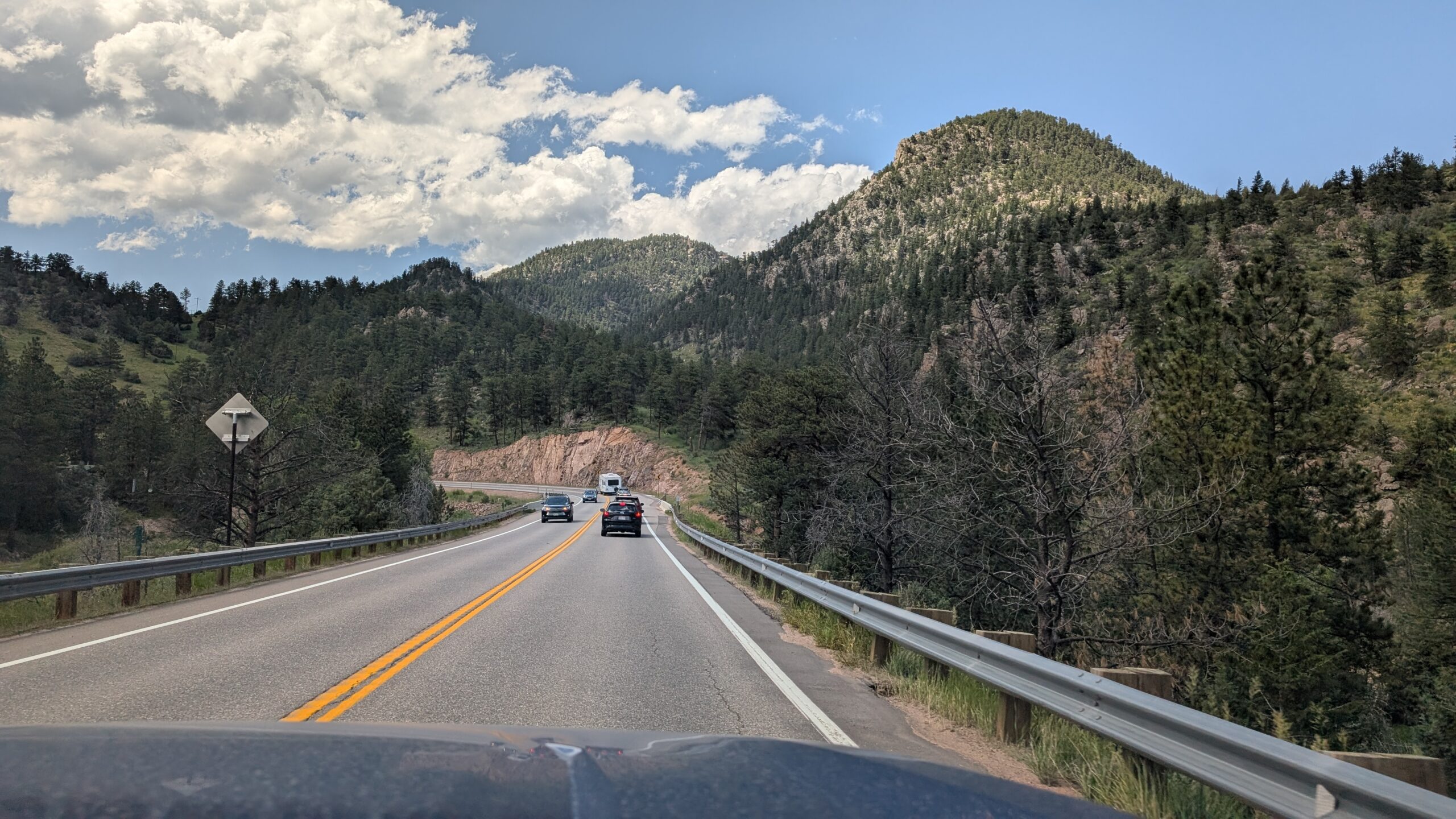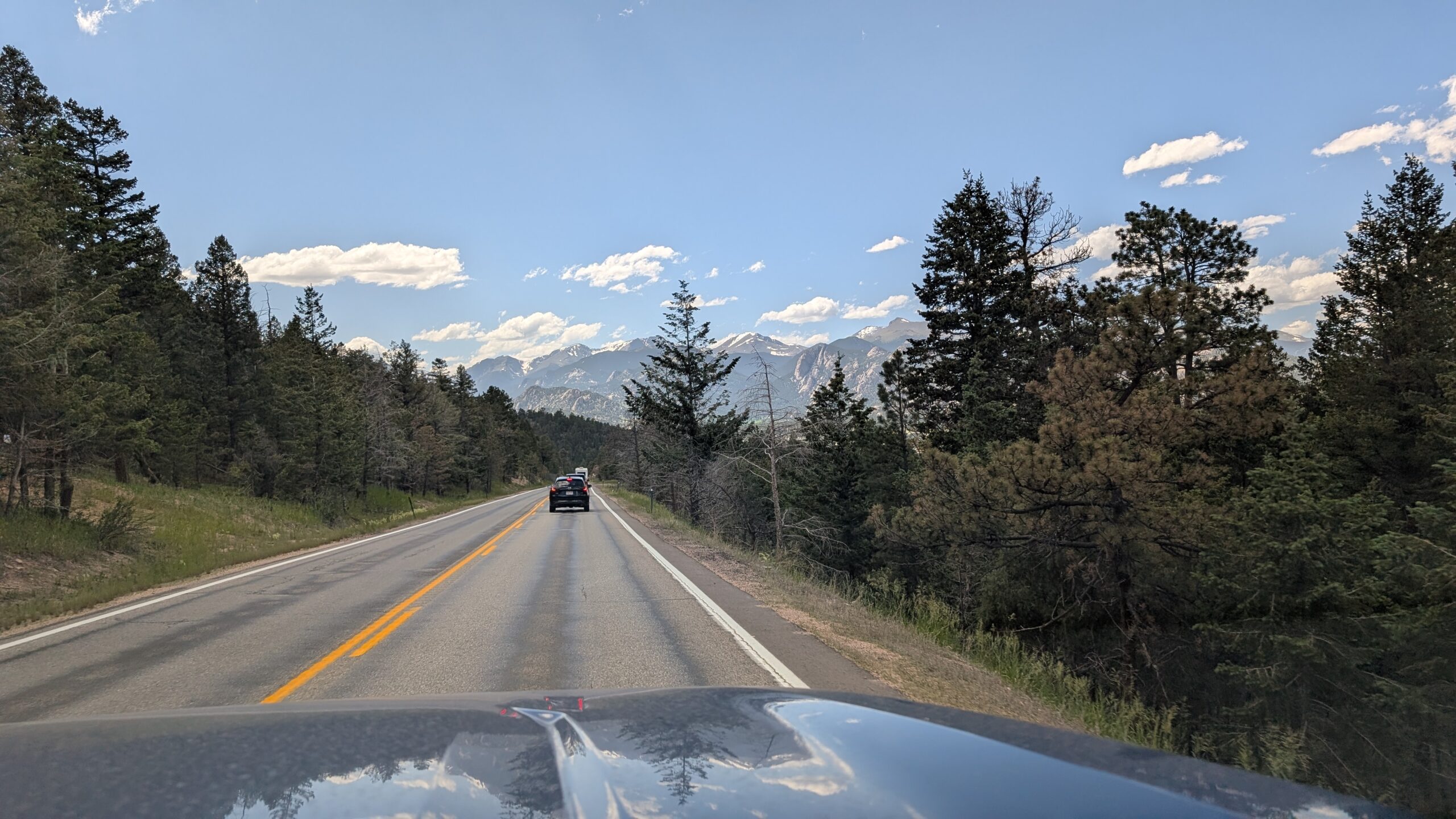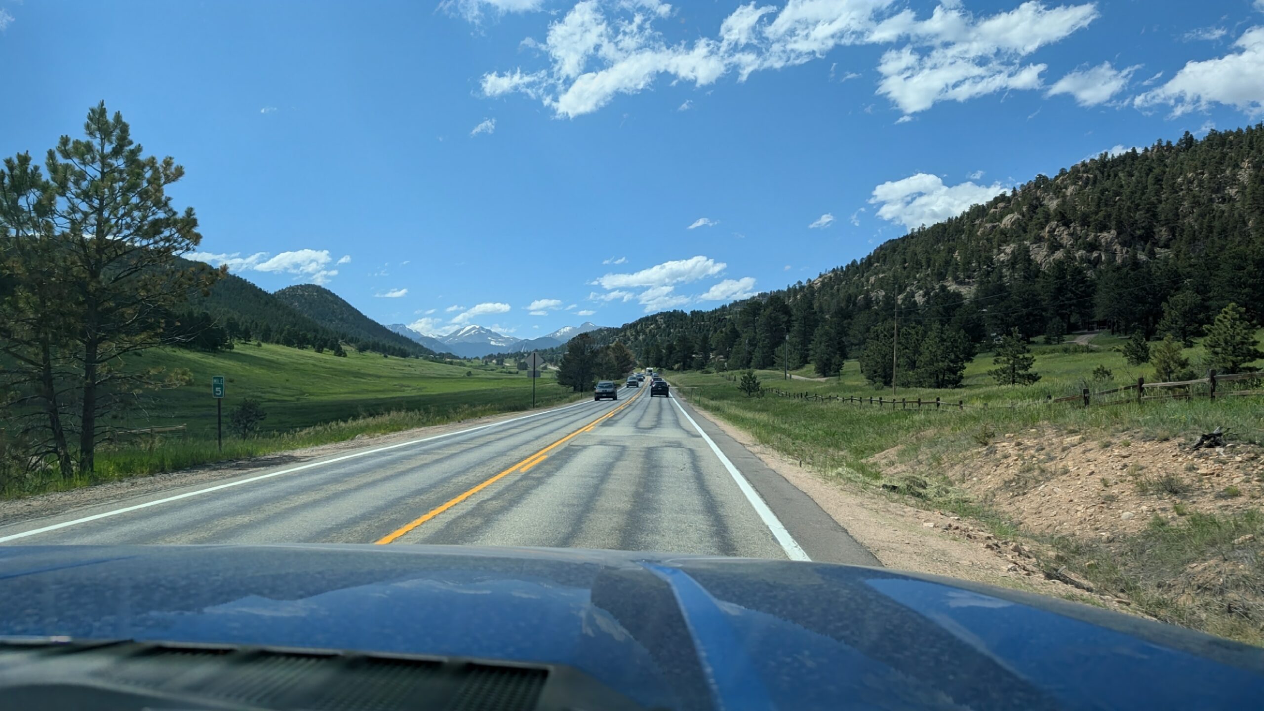 The drive into Estes Park was fairly uneventful. There’s a fairly scenic canyon drive along US 36, but the real scenery isn’t there until you’re basically right in Estes Park. This was the descent down the final big hill before reaching Estes Park.