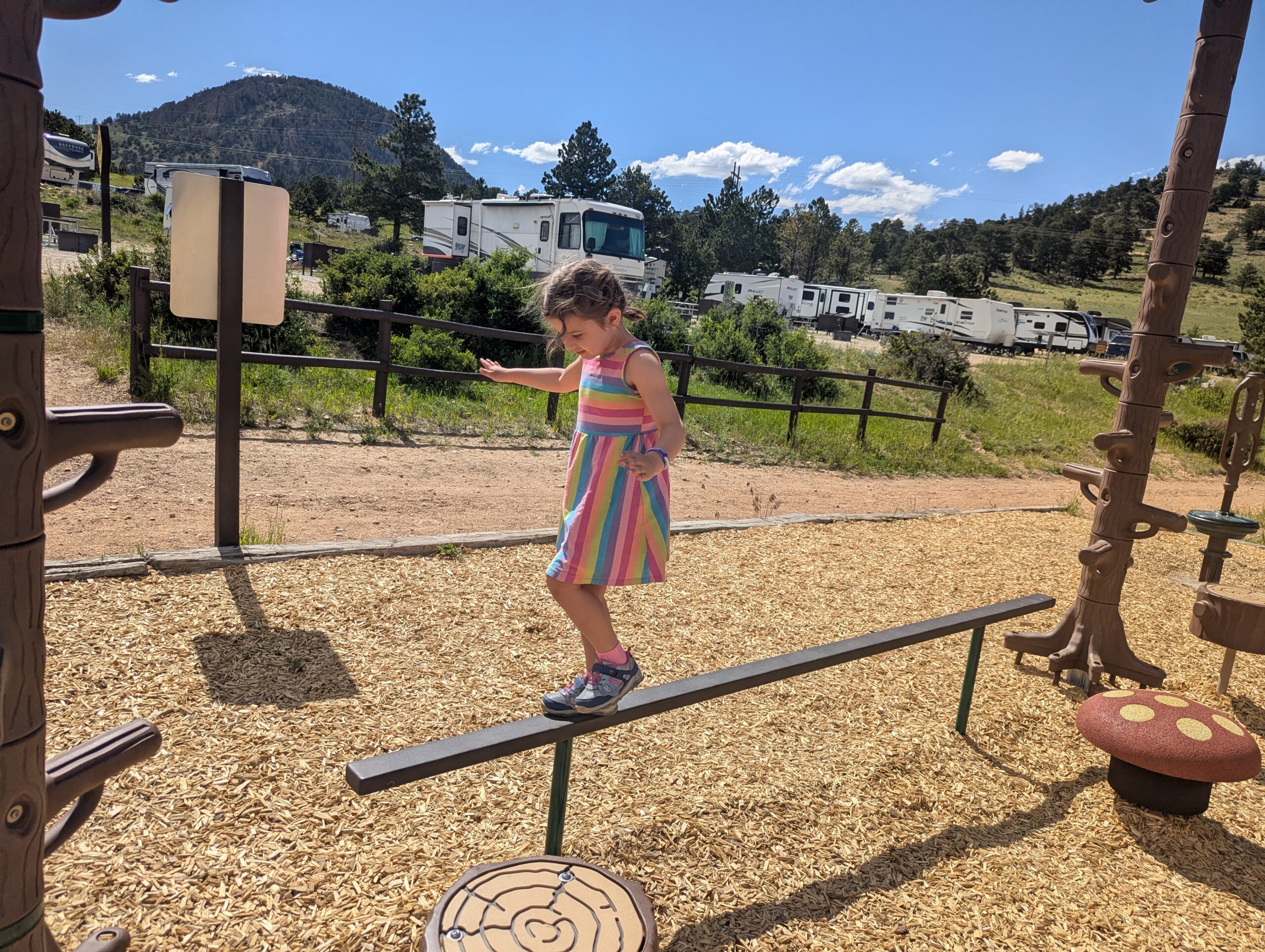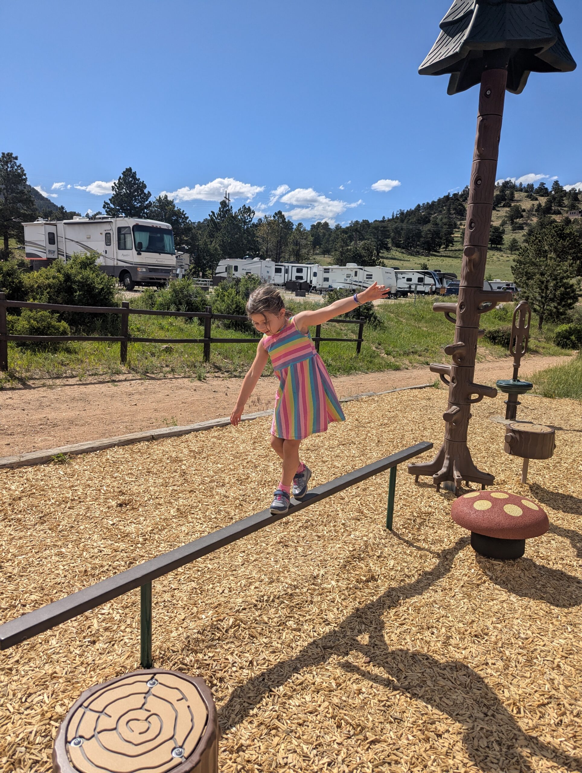 We checked into our campground at Estes Park at Mary’s Lake – such a relief to be out of Colorado Springs. We’re right next to the bathroom and a cool playground.
