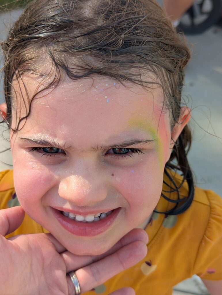 (These kids drive us crazy with their lack of executive function skills. I told Emilia that if she got soaked in the splash pad, the face paint would wash away. Then she went in the water, and when I told her it was washed away, she cried about it. I had taken a picture of the face paint beforehand, but that wasn’t good enough. She wanted her new rainbow unicorn stuffed animal to see her rainbow face paint “in person”. )
