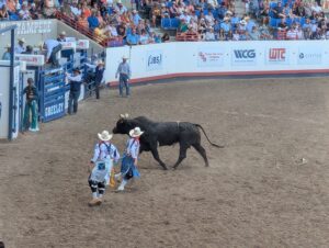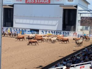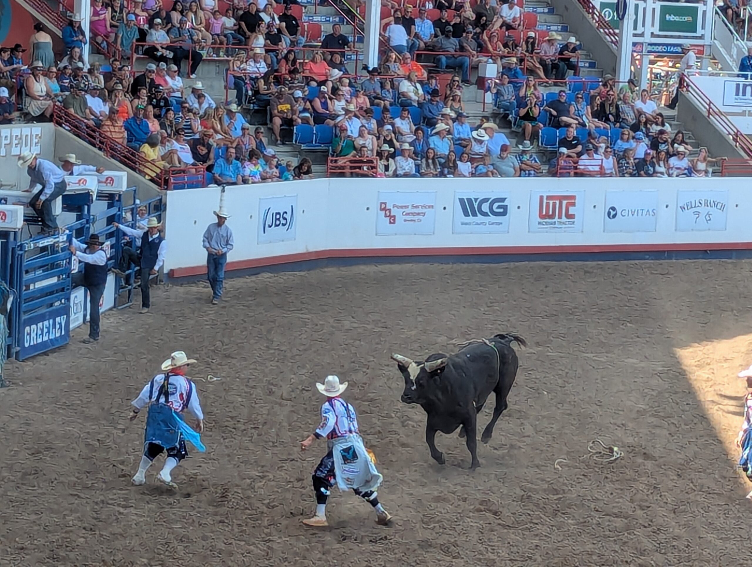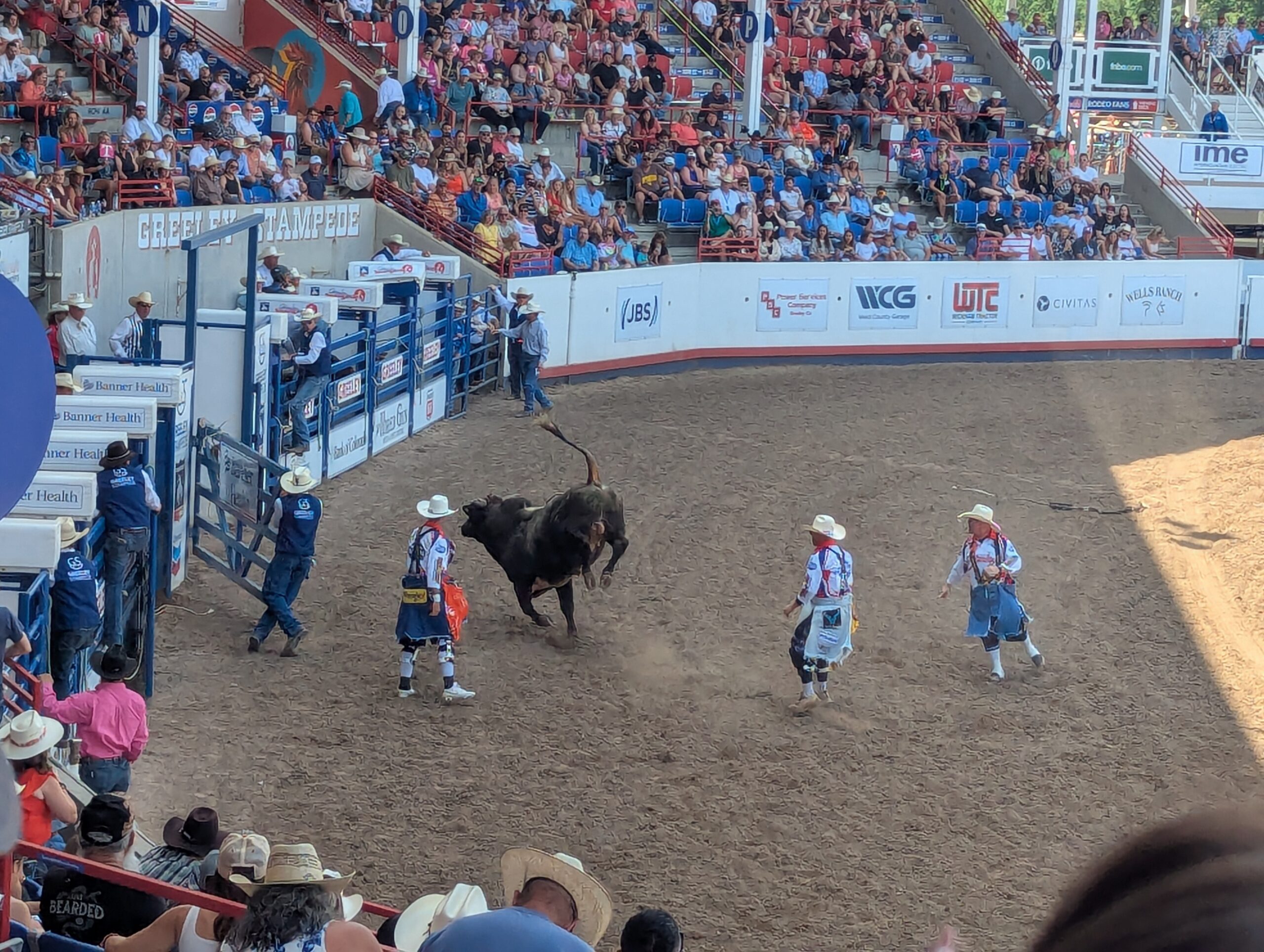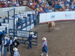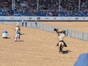 Of course, the main event was the PRCA prorodeo which was a lot of fun! The rodeo started at 1 pm, and Emmett was really wiggly and tired after about an hour. Emilia was fidgety but more interested than Emmett. Phil was interested, but I was probably the most excited about the rodeo. (I even got a Greeley Stampede rodeo T-shirt so that I can rep the official merchandise.) Bronc and bull riding were the most exciting events to watch since you can’t predict what will happen.