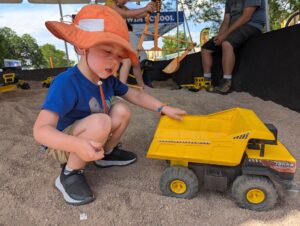 dug in a sand box with construction toys,